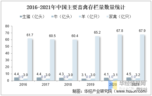 從下游養殖業來看,隨著近年來我國畜牧業的不斷發展,養殖規模的不斷擴大,使得我國飼料需求不斷增加,促進了我國工業飼料行業的發展。據資料顯示,2021年末我國生豬存欄4.49億頭,同比增長10.9%;牛存欄0.98億頭,同比增長2.7%;羊存欄3.2億只,同比增長4.3%;家禽存欄67.9億只,同比增長0.1%